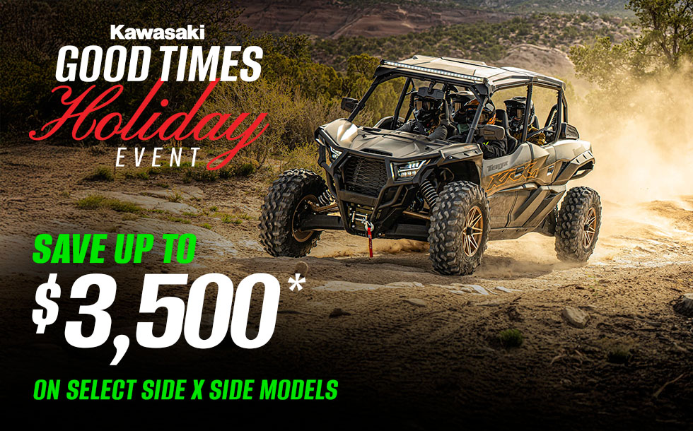 *Model & year exclusions apply. May be combined with promotional retail financing rates. Incentives are available at participating Kawasaki dealerships. Offer valid through 01/31/2026. Subject to change without notice. Offer available on approved purchases of select new unregistered Kawasaki vehicles.